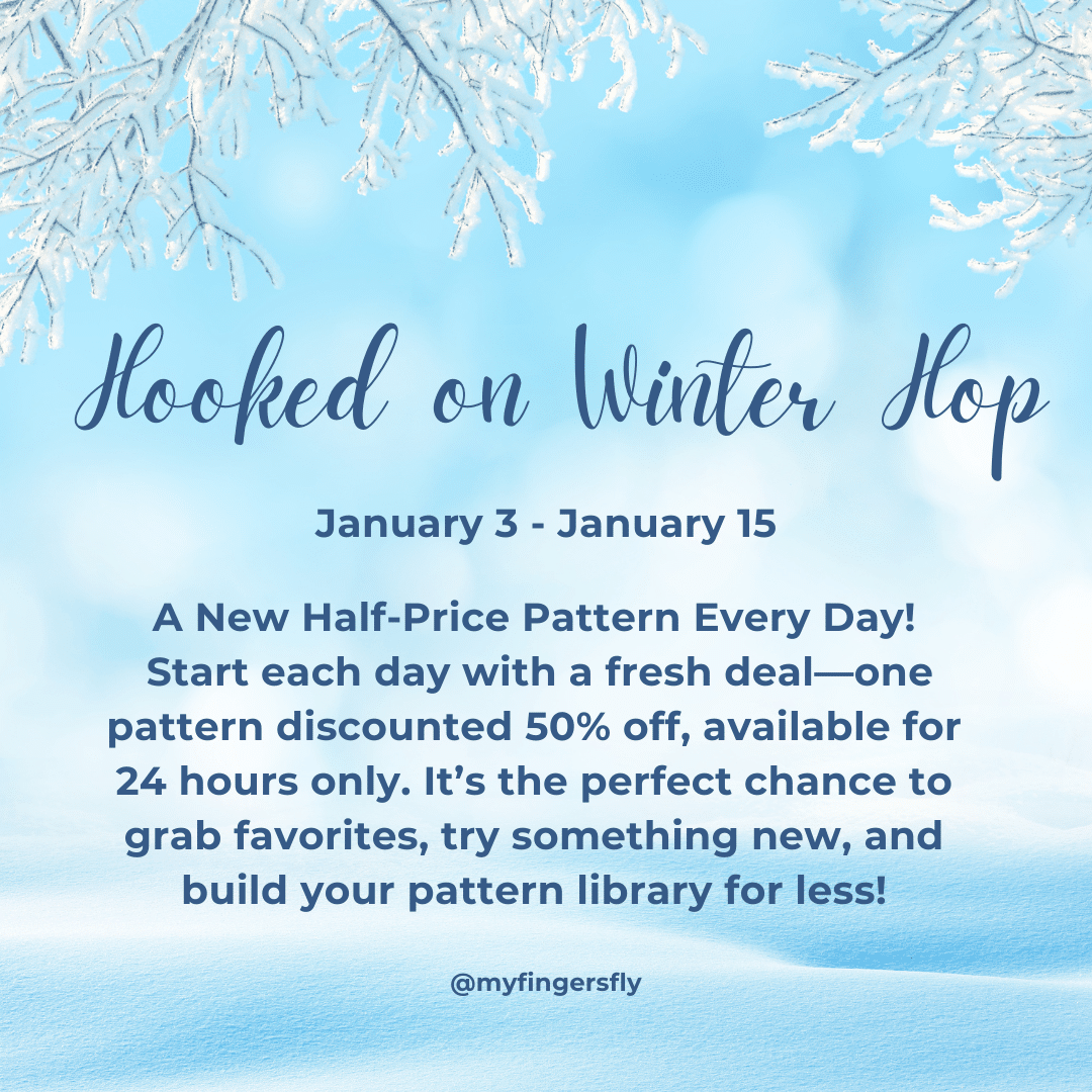 January 3-15, 2026 – Hooked on Winter Hop hosted by My Fingers Fly at the Crochet Designer CommunityGet your new yarn stash ready for and exciting event that is specifically for Warm Winter Wear and Winter Home Decor!