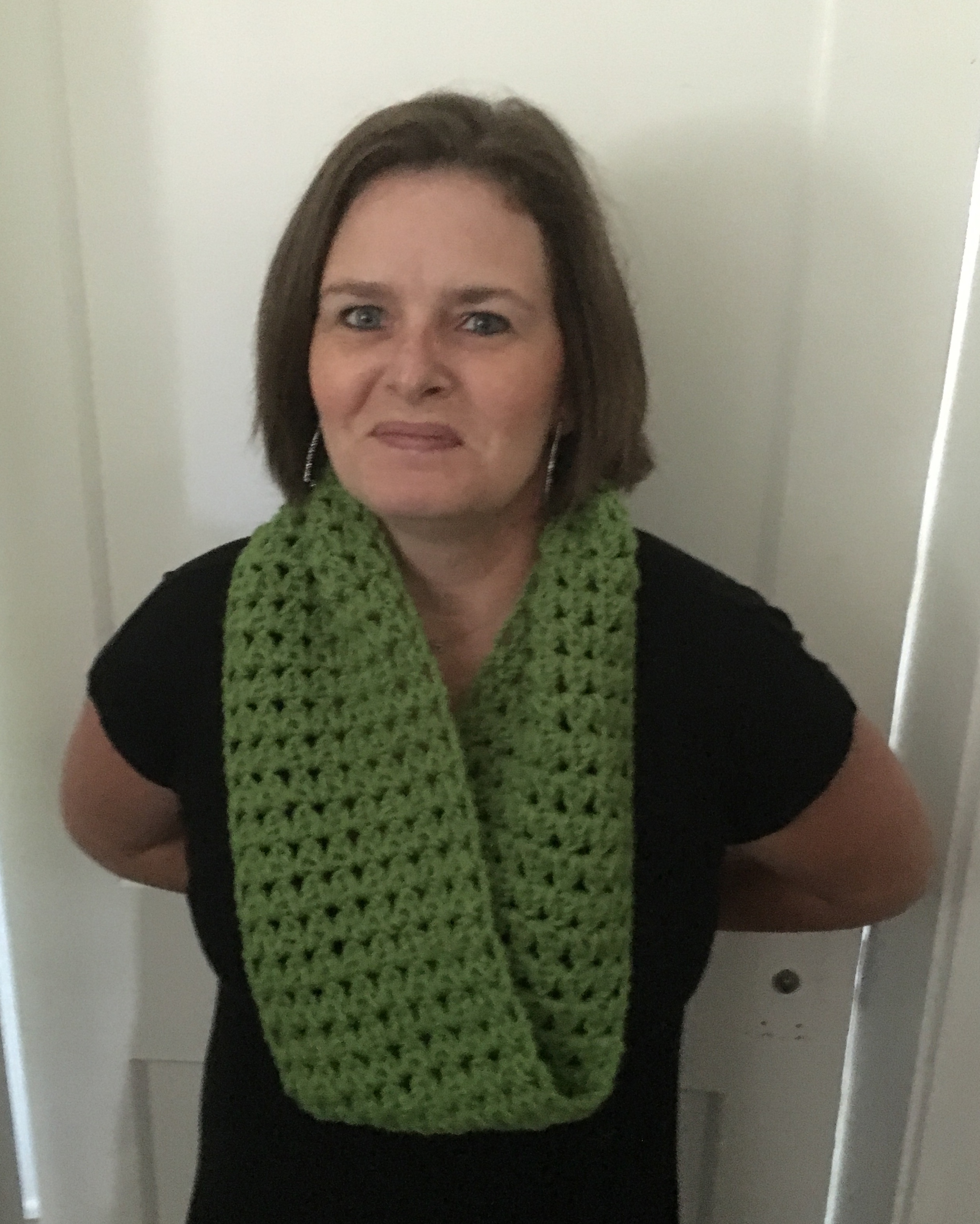 The Unisex Infinity Scarf can be purchased from my Etsy Shop here.  The Unisex Cowl can be purchased here from my Etsy Shop.  You can find out more about the designer there as well.  I found this really easy crochet video on YouTube, I decided to make 2!  One in light green and the other in brown, white and gray.
