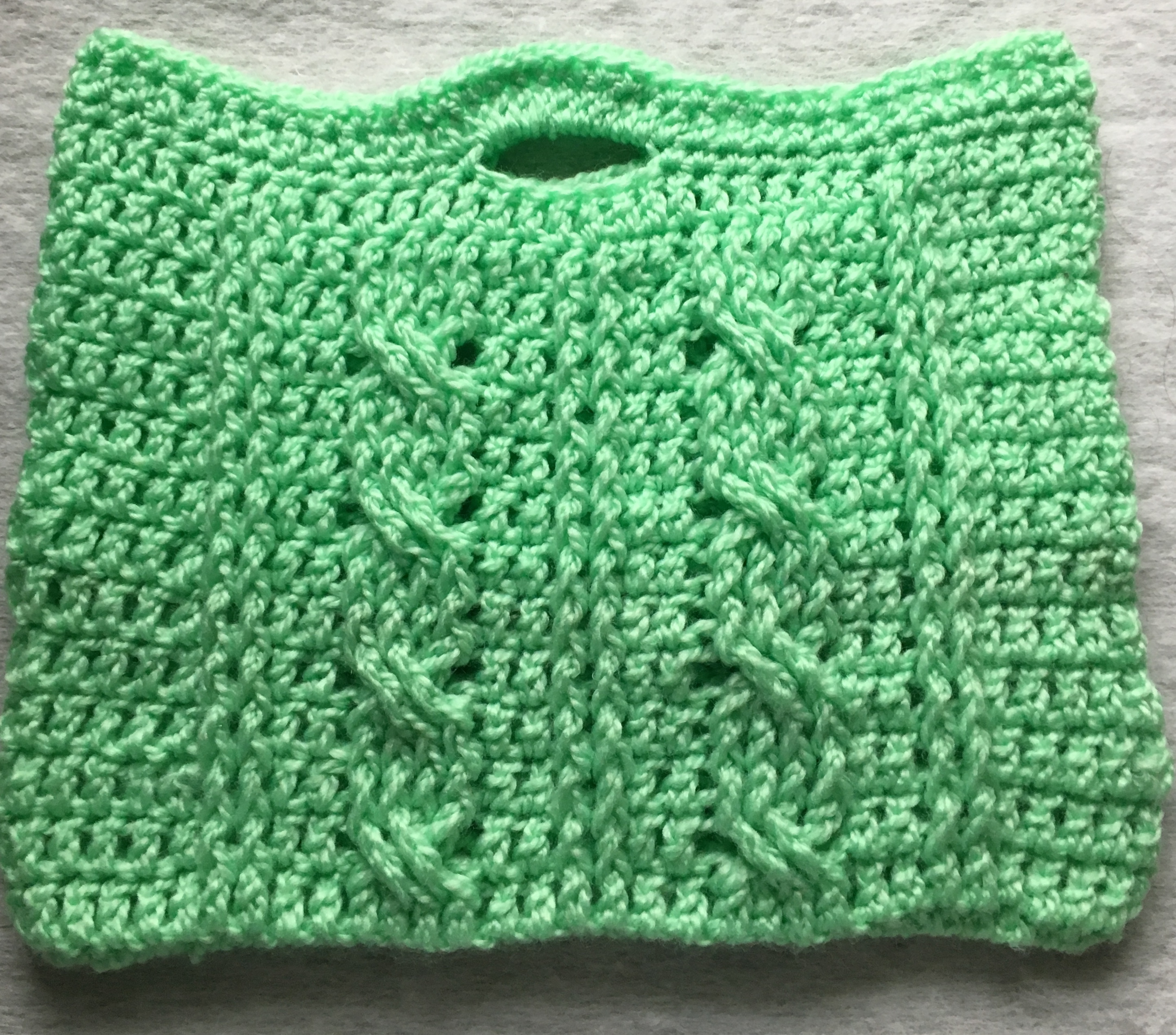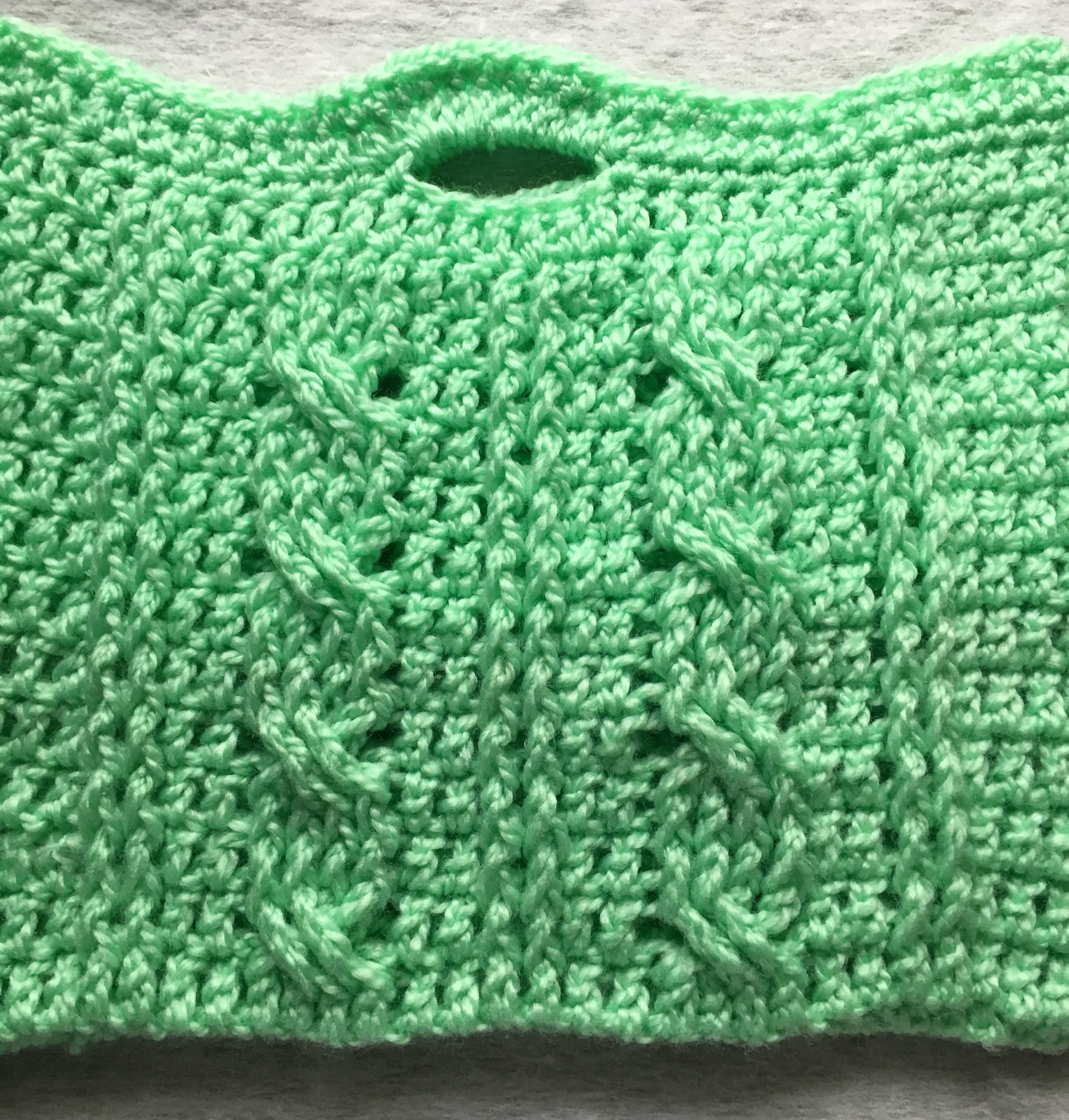 Now that you tried the large version of the Sharon Bag, here is a smaller one. The smaller version has more Braids or Cable stitches. I fell in LOVE with these stitches as I was testing a pair of crocheted fingerless gloves.