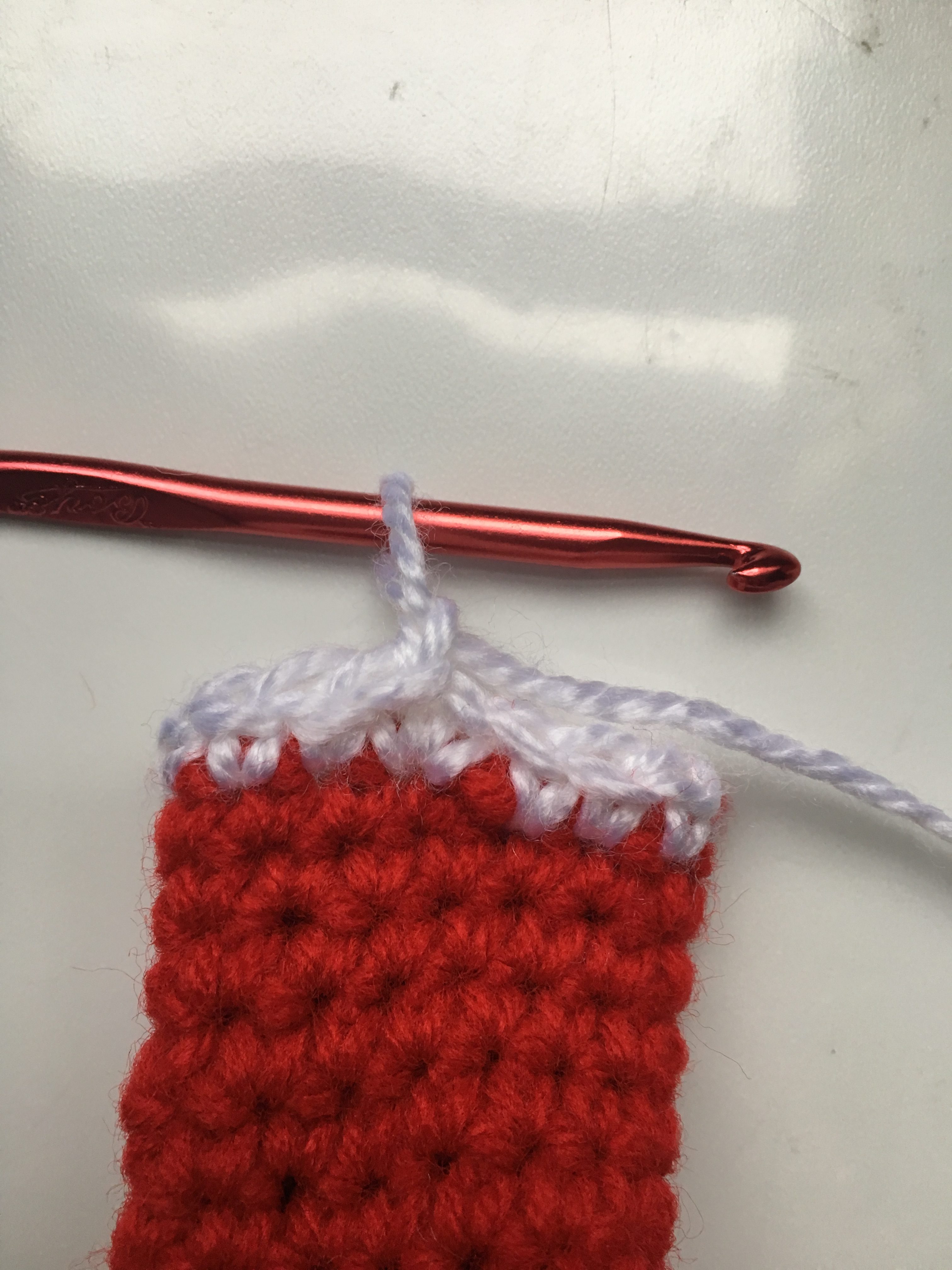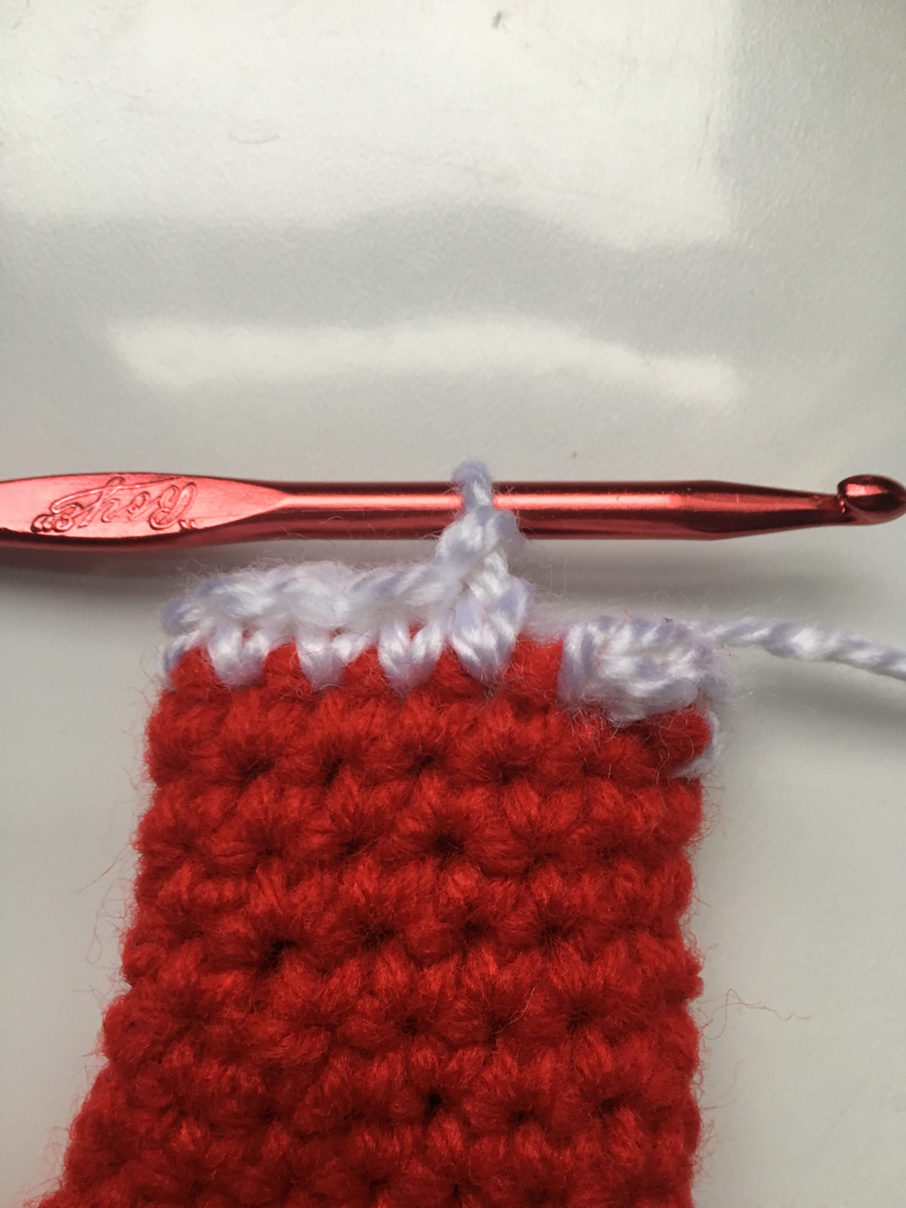 I used Premier Basic DK in Red and White. 100% Acrylic. (360 yds/ 280 m) (3.5 oz/100 g)