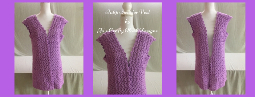 Thank you for trying the Tulip Sweater Vest Pattern! Check out my other GREAT patterns at my Etsy Shop OR at the Ravelry Store under Jo’s Crafty Hook OR at my website joscraftyhook.com! While you are at my website be sure to add your email address for my Mailing List and Newsletter. This way you will be notified when I release another pattern or blog post! If you have any questions or concerns about any pattern find me at Jo’s Crafty Hook Designs on Facebook!